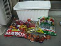 チューリップの植えつけ用の土、プランター、球根です。昨年はあたたかったので、11月に植えたら年末にはもう芽が出てしまいました。 |