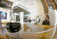 | 円周魚眼、絞って(F7.5)広範囲にフォーカス。虫の目? | 対角線魚眼、左の円周魚眼をトリミング(四隅にわざと少し黒い部分を残して)。 |