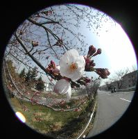 サクラ。宝塚市と伊丹市の境。まだ一部の樹の一部に咲いているだけですが。。魚眼写真。
